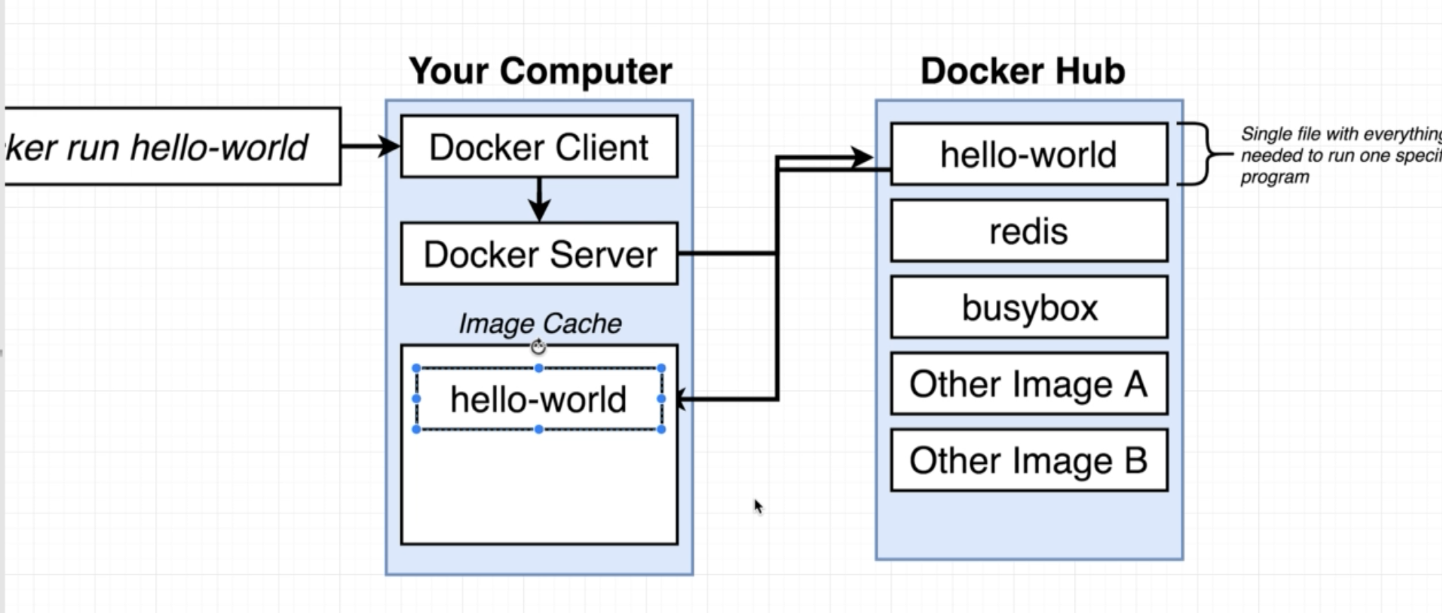 Docker server在接受到我们的指令之后,它首先会check 我们的image cache,that is,一个可以cache我们的docker image copy的文件库。当我们才刚刚装上docker的时候,image cache是空的,自然也就没有hello-world的copy,所以这时docker server就会向远程的docker hub发出pull请求,向我们本地的电脑上安装这个image。这里,docker hub is a repository of free docker images that you can freely download and run on your pc,就像是apt-get或者homebrew这样的包管理器一样。