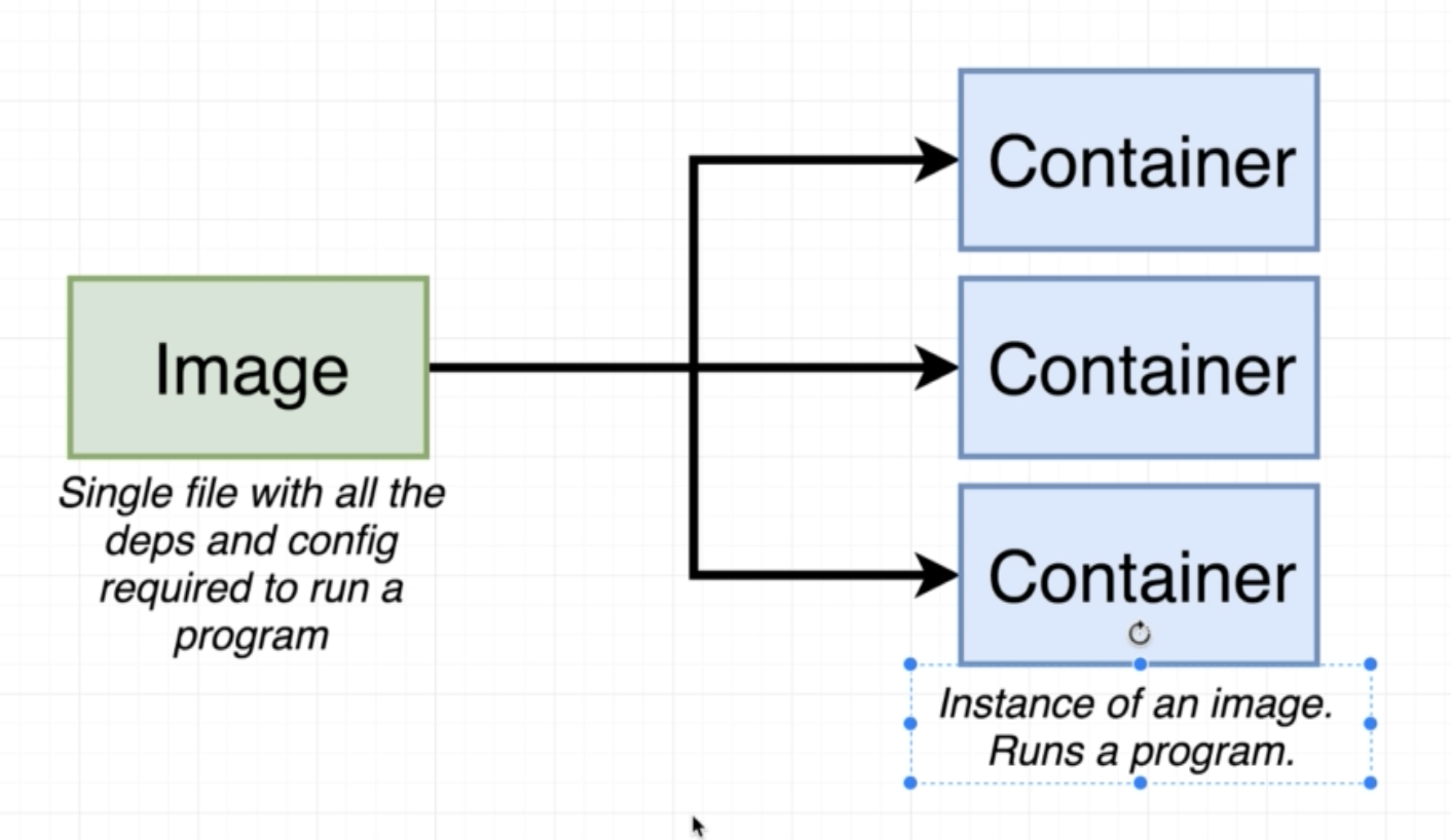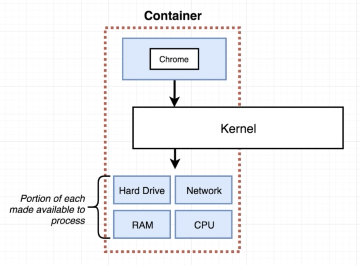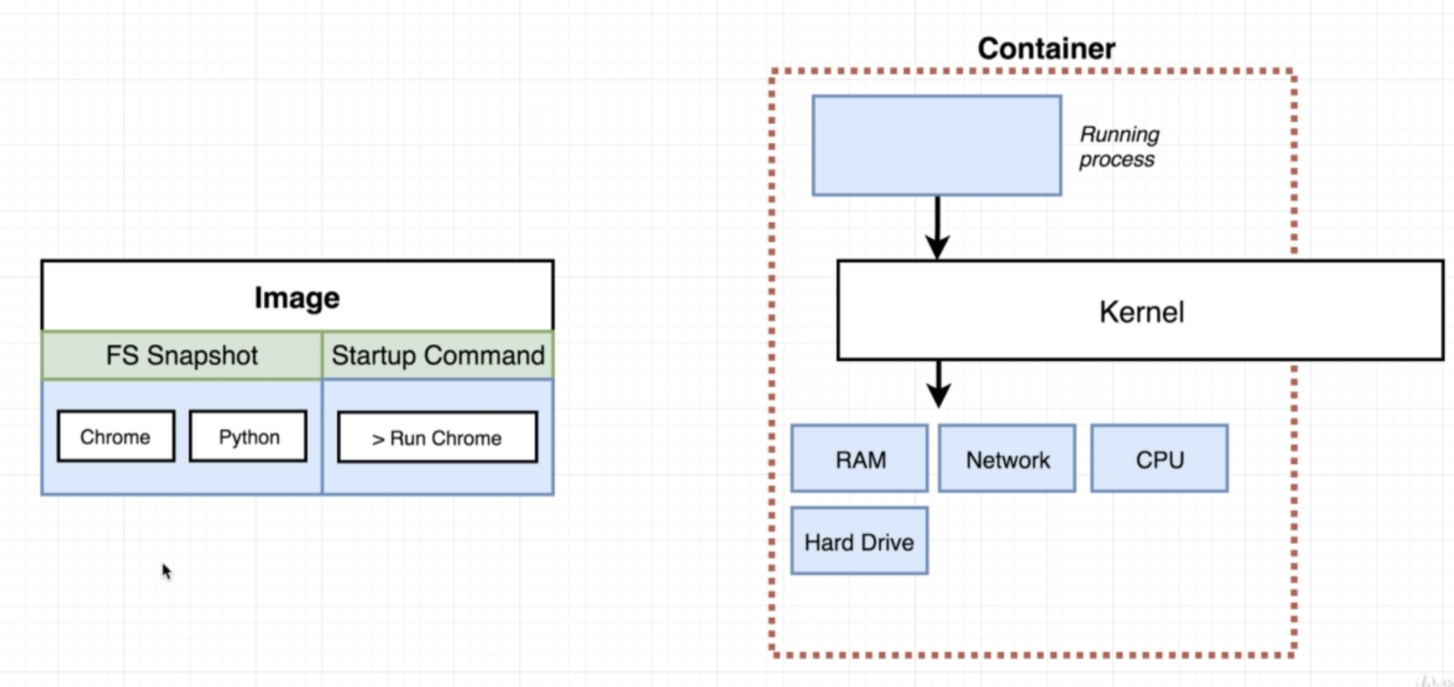 When we talk about image, we’re really talking a file system snapshot, which is essentially kinda like a copy paste of a specific set of directoty or files. And image will also contain a specific startup command. 当我们创建容器的时候,docker会将image里面的文件快照拷贝到container的资源库中,然后执行startup命令,调用chrome或者其他进程,docker运行就开始了。