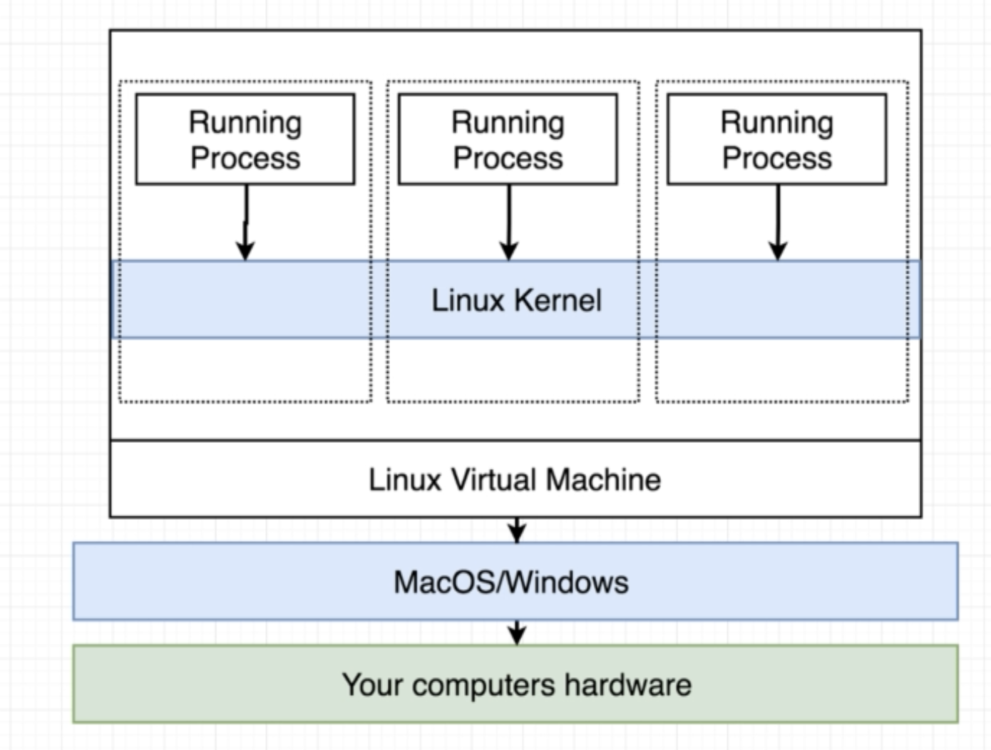 实际上,namespacing 和 control group是linux系统下的一个特性。我们在win或者macos上安装docker的时候,同时安装了一个linux vm,所以我们的container也是在这个linux vm之中创建的,docker内部的系统调用也都是通过vm中的linux kernal来完成的,包括文件系统分区、进程之间的isolating和constraining等。