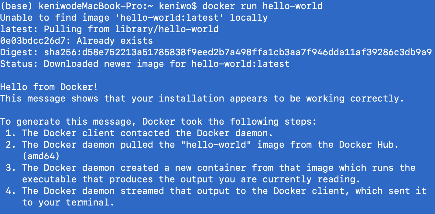 当我们从Terminal输入语句执行的时候,docker client会take 我们的command,然后把command传递给docker server,在hello-world这条command中,我们实际想要传达的意思是我们set up一个新的container,using the image hello-world。 hello-world image实际上包含着一个能打印如下info的小程序,是我们想要利用docker达到的运行的目的。