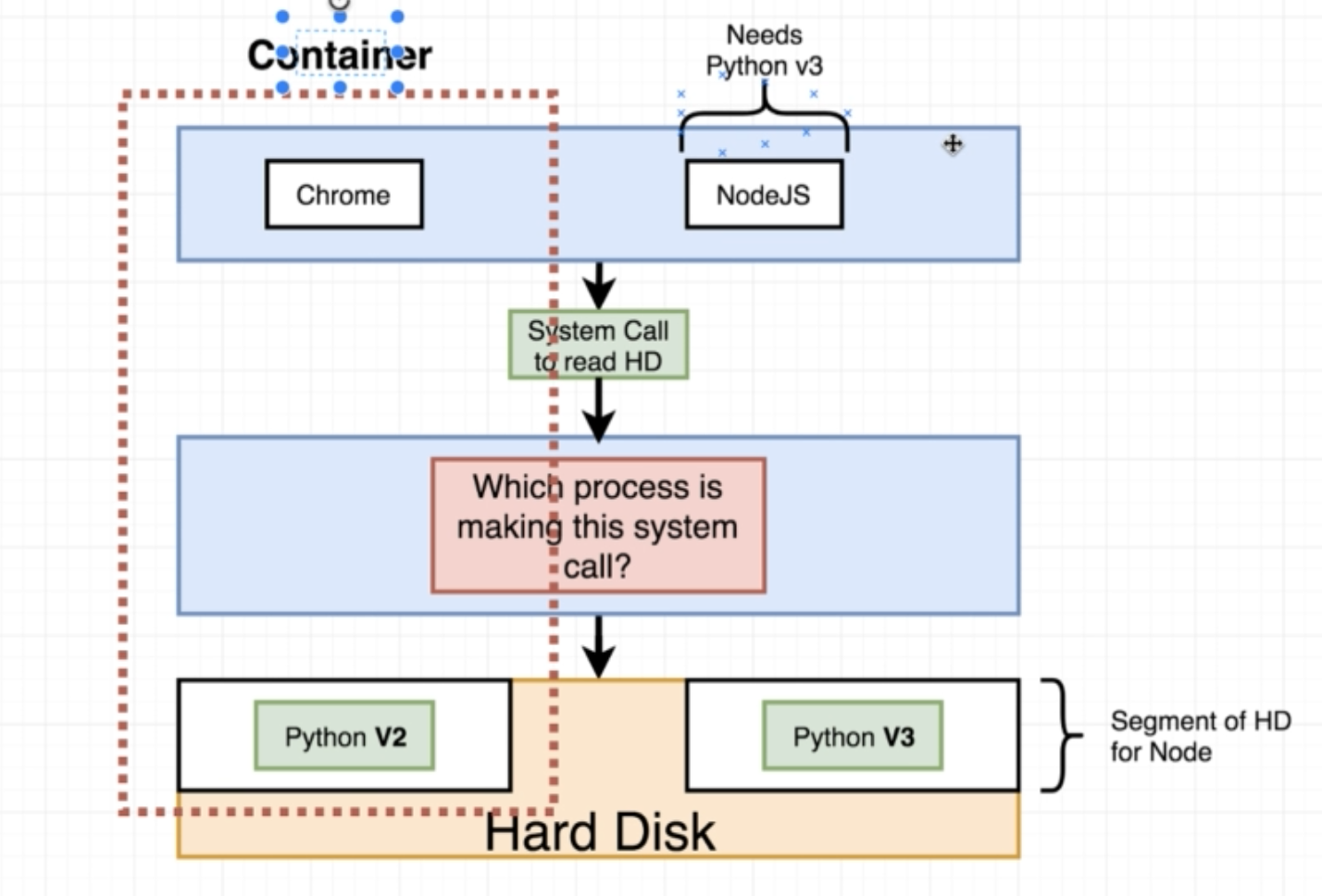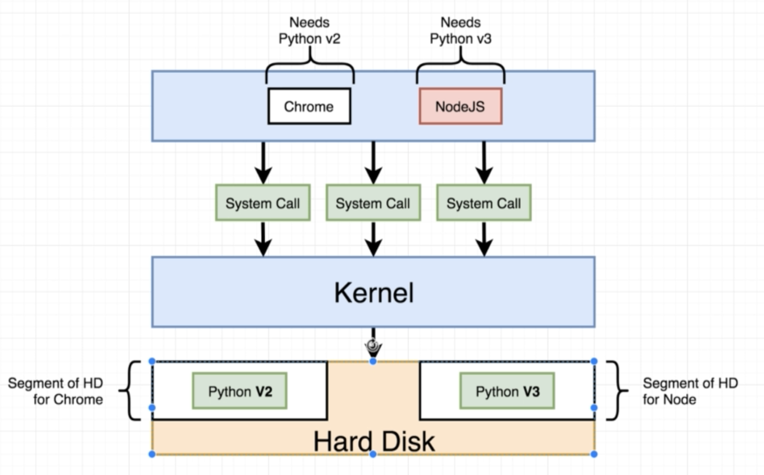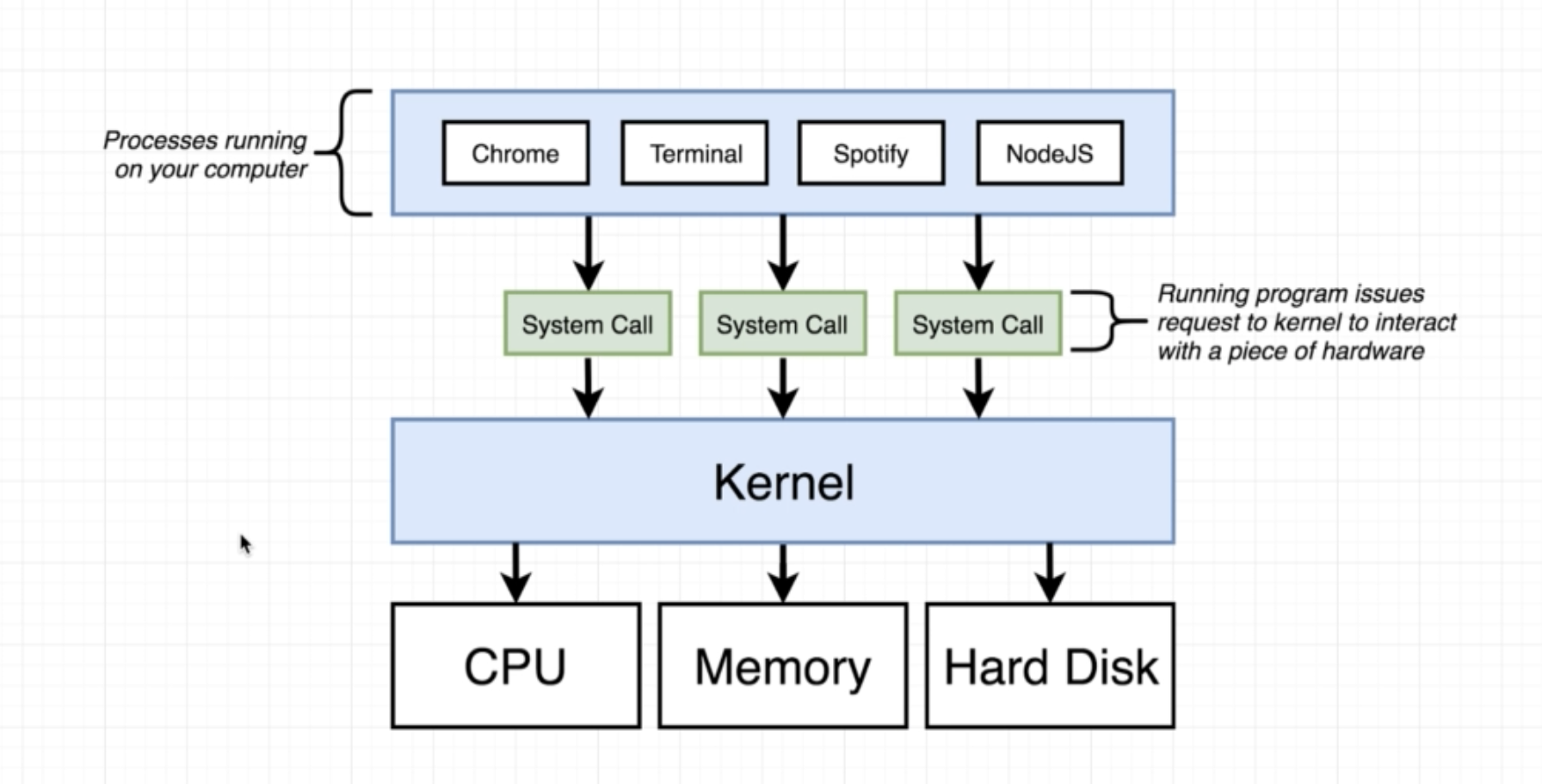 Docker的核心理念就是模仿我们的OS,所以,我们要先理解自己PC上的OS的结构(参见csapp, cmu 15-213)。每一个运行在我们os里的application或者process,当它们要调用cpu或者hard disk的时候,它们是没有办法直接与硬件对话的,二是要借助kernel这个中间层,kernel会帮助我们intermediate机器内部的一些访问请求,进程与kernel交互又是依靠system call来完成的,它实际上是kernel的一些endpoint,或者说可以访问特定文件的函数。