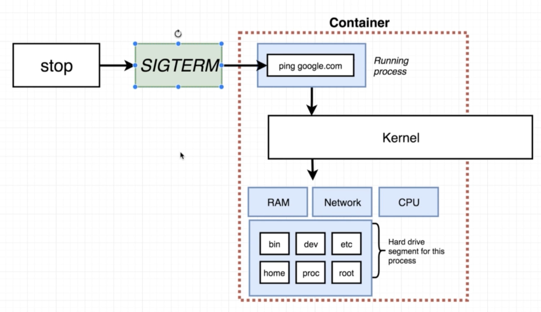 当我们使用docker stop的时候,实际上是向该进程发送了一个Terminate的Signal,进程收到signal之后就会shutdown,但在这之前还会留有一些短暂的准备时间,让container做做简单的清洁。